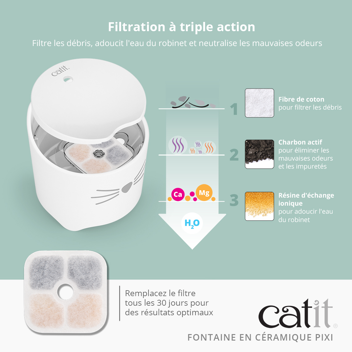 Malgré sa petite taille, la fontaine peut contenir jusqu'à 1,7 L d'eau. Son filtre triple action inclus aide à garder l'eau de votre chat fraîche et propre. Il élimine les odeurs et les impuretés et adoucit l'eau en réduisant les niveaux de magnésium et de calcium. Attention, les filtres de remplacement sont vendus séparément.