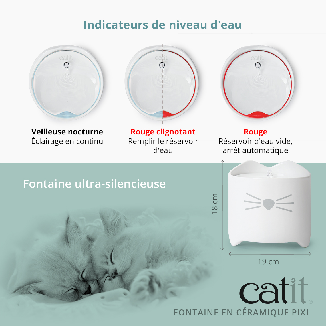 La fontaine vous indiquera quand il sera temps de remplir son réservoir d'eau. Grâce à sa lumière LED intégrée, il est facile de voir lorsque la fontaine manque d'eau. Le voyant s’allumera en rouge pour vous avertir.